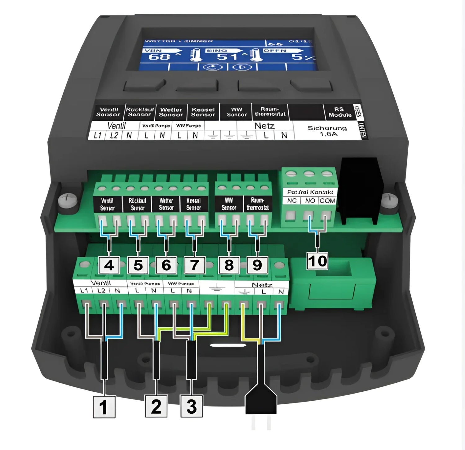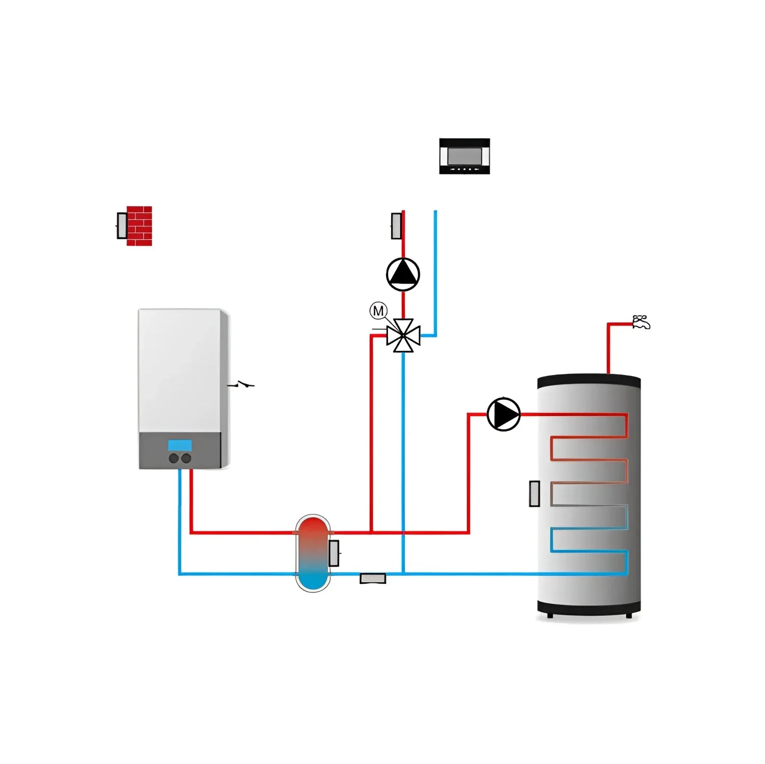 Cinntíonn an rialtóir ciorcaid téimh seo rialú tairiseach, ag brath ar an aimsir, ar theocht an tsreafa ag baint úsáide as an braiteoir teochta lasmuigh atá san áireamh. Rialaíonn sé mótar an mheascthóra freisin chun méadú ar shreabhadh fillte a chinntiú nuair a úsáidtear meascthóir ceithre bhealach. Fágann sé seo go bhfuil an téamh níos éifeachtaí, agus baineann tú leas as úsáid fuinnimh is fearr.