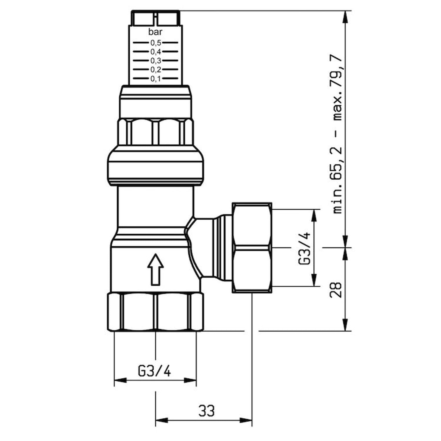 K dispozici v rovném nebo prostorově úsporném rohovém provedení; připojení: vstup s vnitřním závitem G¾, výstup s plochým těsněním a převlečnou maticí G¾. Nastavitelný tlak je plynule nastavitelný mezi 0,1 a 0,5 baru.