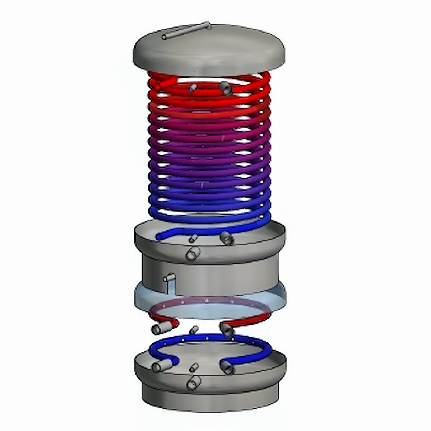 Spremnik je izrađen od čelika kvalitete S235JRG2 u skladu s DIN 4753 i europskim standardom EN 12897; izmjenjivač topline za pitku vodu je valovita cijev od nehrđajućeg čelika (1.4404) proizvedena u Njemačkoj. Spremnik je iznutra neobrađen, izvana premazan temeljnim premazom i podijeljen u dva toplinski odvojena dijela: zagrijavanje pitke vode na vrhu i međuspremnik za grijanje na dnu.