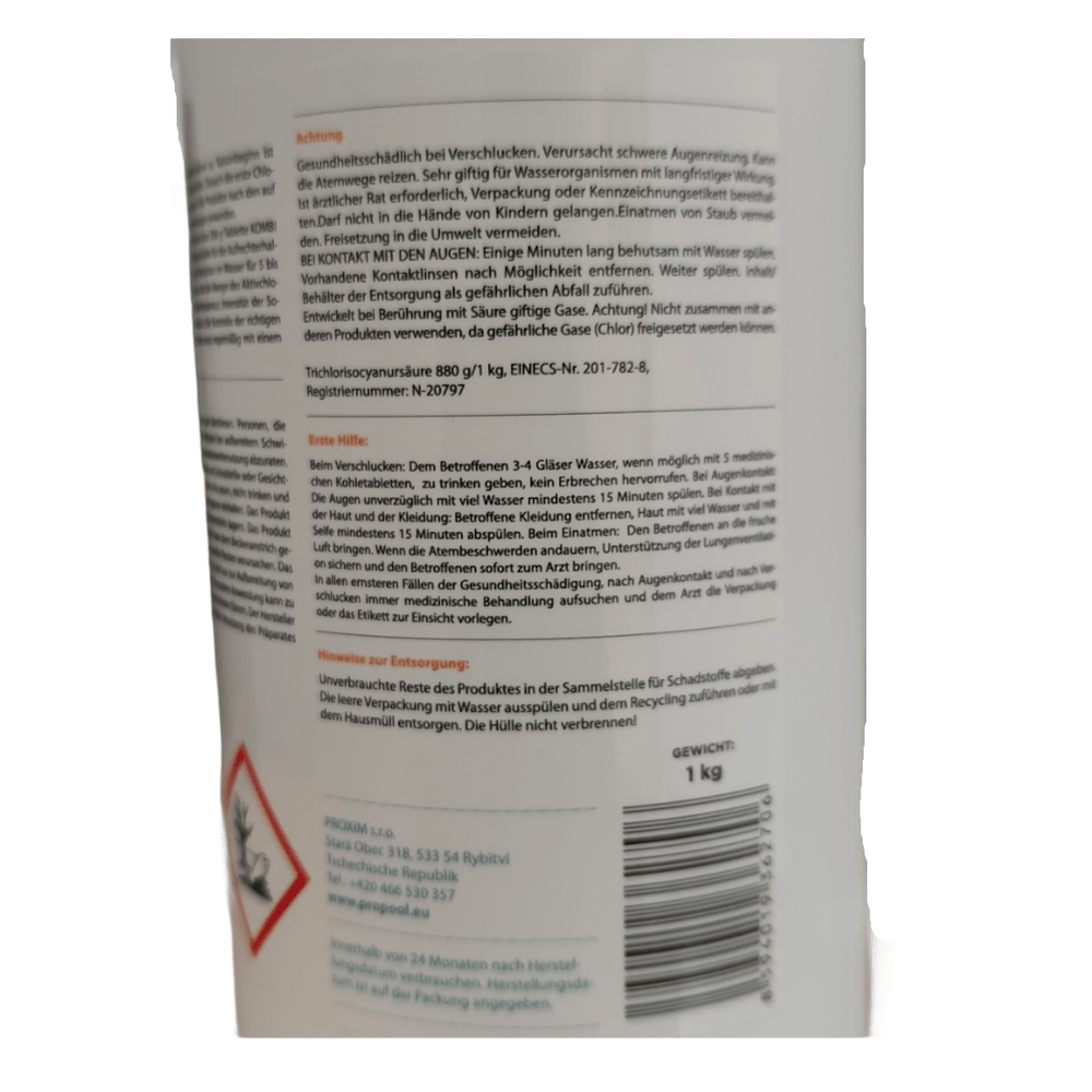 Es ist von größter Wichtigkeit, die Gebrauchsanweisung aufmerksam zu lesen und zu befolgen. Die Kombi Tabs dürfen nicht in direkten Kontakt mit Folie, Kunststoff oder Poolbeschichtungen kommen, da sie diese Materialien verfärben oder weiße Flecken verursachen können. Ebenso sollten sie nicht mit anderen Chemikalien vermischt werden, da dies gefährliche Reaktionen auslösen kann.