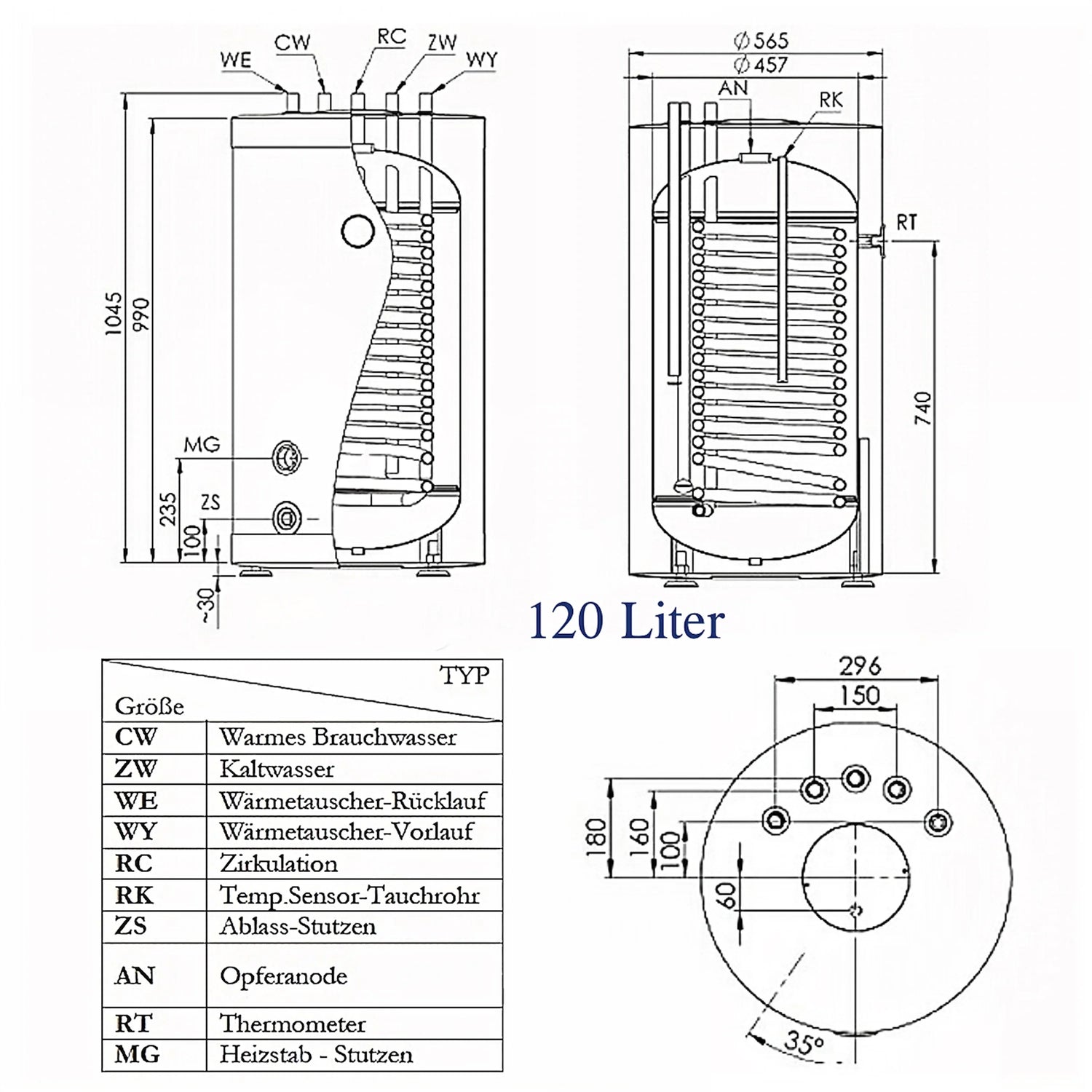 – 120 lítear: Ø 565 × 1045 mm, folamh 71 kg