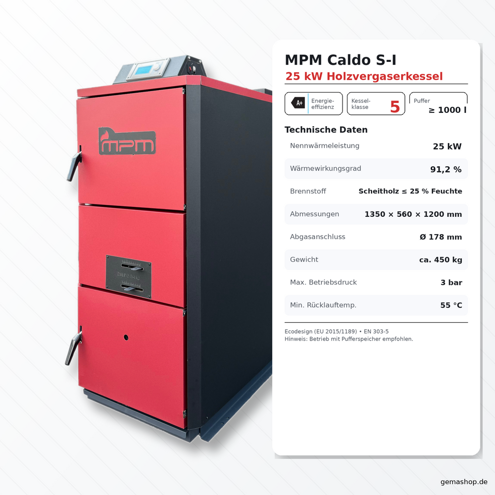 MPM Caldo SI 25 kW este o centrală termică pe lemne cu gazificare, cu postcombustie ceramică. Designul său promovează o ardere eficientă cu emisii reduse și este destinată funcționării cu rezervor tampon și creștere a temperaturii pe retur - ideală pentru case unifamiliale mai mari sau camere de centrale termice cu cerințe mai mari de putere termică.